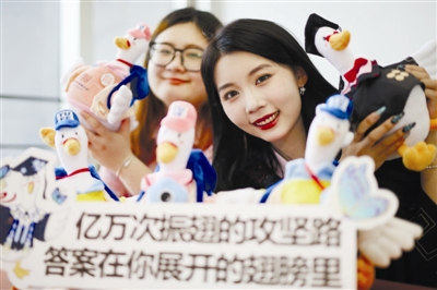 天津财经大学艺术学院毕业生刘玥彤(右)是校园“鸭当斯密”IP的第二代接力者,在王紫藤学姐(左)的带领下,她做出了一系列衍生形象,并单独设计,给“鸭当斯密”布偶换上毕业装,让一个灵感来自校园小鸭子的设计变得光彩照人,一经推出就受到广大师生的喜爱。